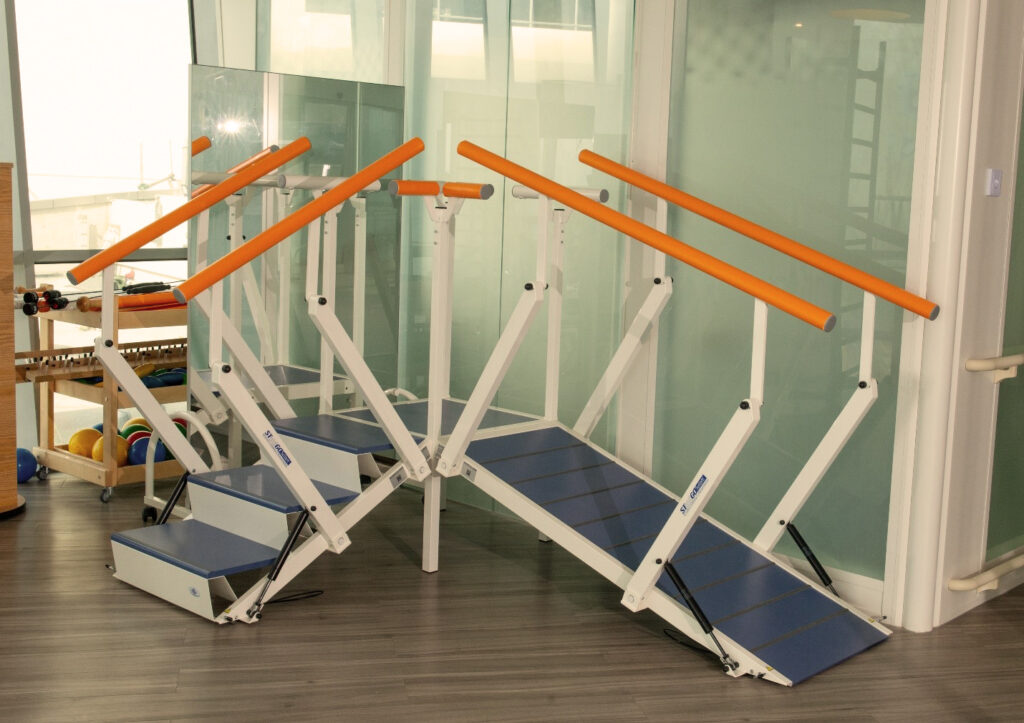 Gait training and stairs training tool. Hardwood platform with anti-slip safety tread. Unit includes an adult bar and a child’s bar.